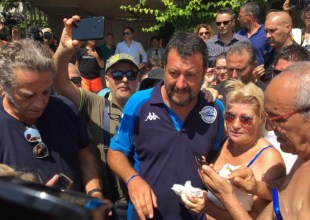 Selfie e bagno di folla, la tappa a Taormina di Salvini. Cartellone a Mazzeo: “La Sicilia non si Lega”