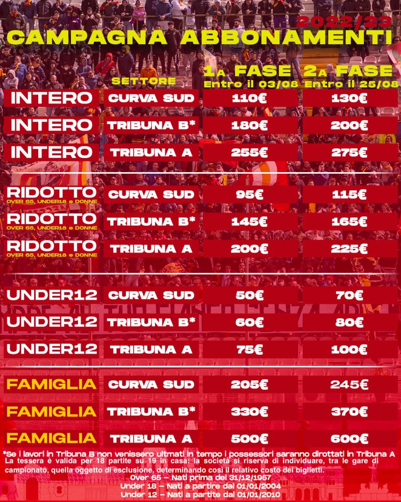 Ed ecco i prezzi. Per quanto riguarda la prima fase, quindi per chi sottoscriverà la tessera entro il 3 agosto, l’intero per la curva sud costerà 110 euro, per la tribuna B 180 euro e per la A 255. Gli interi nella seconda fase di campagna abbonamenti, quindi dal 4 al 25 agosto, costeranno rispettivamente 130, 200 e 275 euro. Diversi i prezzi ridotti, che si riferiscono a donne, over 65 e under 18. In curva sud si pagherà 95 euro fino al 3 agosto, poi 115; in tribuna B 145 nella prima fase e 165 nella seconda; in tribuna A prima 200 e poi 225. Ancora più basse le cifre per gli Under 12: 50, 60 e 75 euro fino al 3 agosto per Curva, tribuna B e tribuna A; 70, 80 e 100 nella seconda fase.