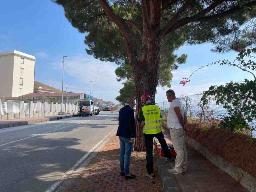 Oggi la prima prova su un albero che sorge di fronte al complesso Linea Verde. Una ditta specializzata, incaricata da Messina Servizi, tramite dei macchinari simula delle forti raffiche di vento (fino a 200km/h) per testare la tenuta dell’albero. Alla fine delle indagini si tireranno le somme di quali e quanti saranno gli alberi a rischio schianto e si procederà con l’abbattimento.