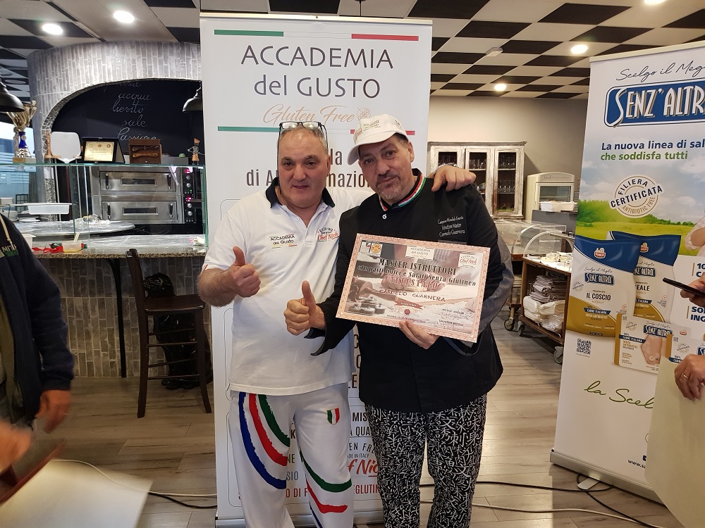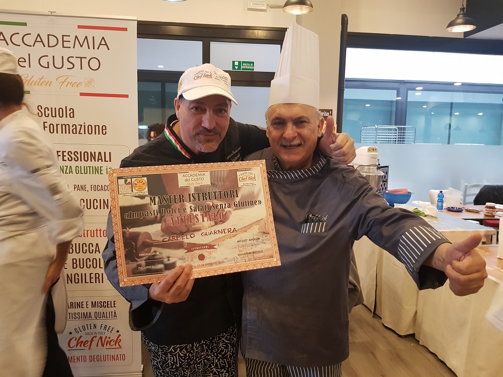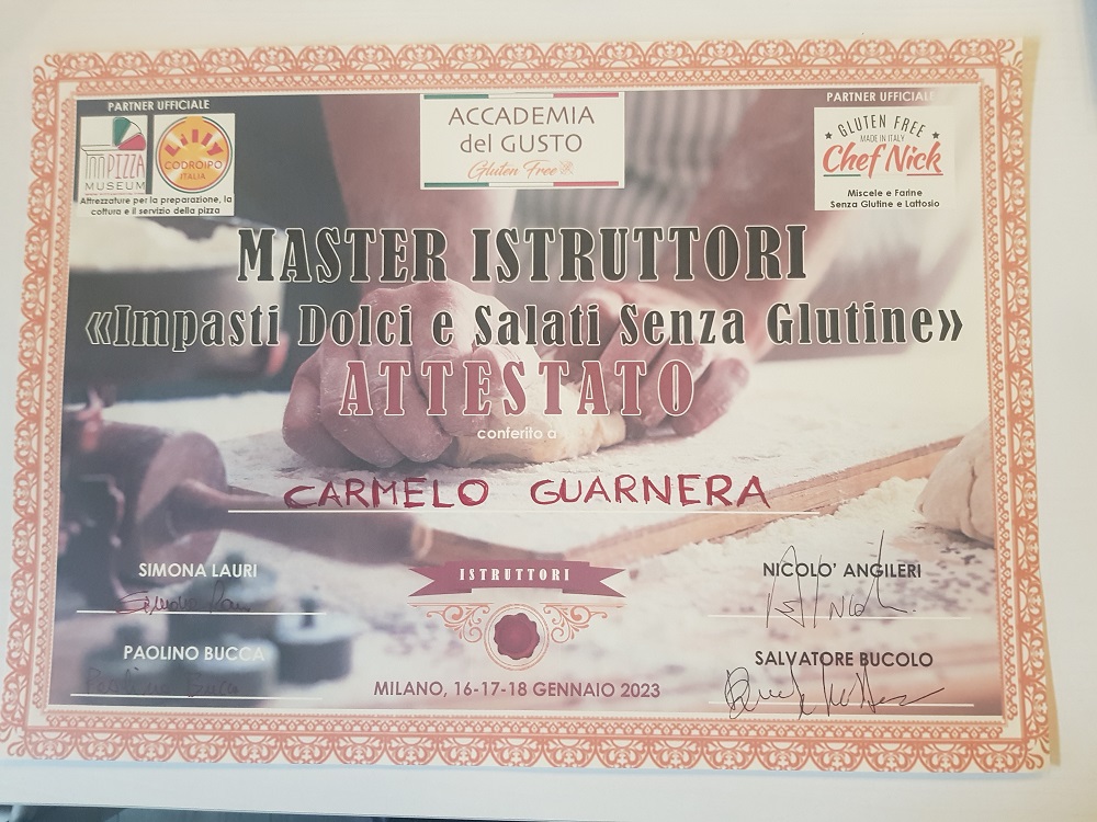 Il 16-17-18 gennaio scorso a Nerviano in provincia di Milano Carmelo Guarnera e’ stato scelto dall’ Accademia del gusto come istruttore ufficiale guidata dai maestri grande suoi amici Paolino Bucca Nicolo’ Angileri , Salvatore Bucolo e la dottoressa Simona Lauri per il primo master istruttori gluten free. Grande successo per l’evento e tanti i partecipanti provenienti da tante regioni d’Italia e anche da Svezia, Svizzera, Portogallo, Francia, Isole Canarie , Brasile e Spagna , dopo il master Carmelo Guarnera si e fermato ancora a Milano a fianco dell’amico fratello Paolino Bucca dall’ amica italiana trapiantata in Brasile Grace Fraschini anche lei master in Sud America e anche campionessa mondiale . Insieme durante il master hanno sfornato pizze e dolci e poi gran finale con il Carmelo Guarnera con l’amico Paolino Bucca insieme per un spettacolo di pizza acrobatica sulle note del brano tratto dal suo album pizza amore e fantasia , Carmelo Guarnera prossimamente nel locale Pizza’s World Messina produrrà la pizza senza glutine con le farine speciali dell’ amico Nik Angileri Gran finale nel festeggiare il compleanno del campione amico mondiale Paolino Bucca nel suo locale a Milano insieme al suo staff Adesso il nostro campione mondiale emerito Carmelo Guarnera si trova in spagna alle isole gran canaria per nuovi progetti lavorativi in cantiere con l’amico campione Carlo Truscelli titolare di un locale alla Gran Canaria-Spagna.