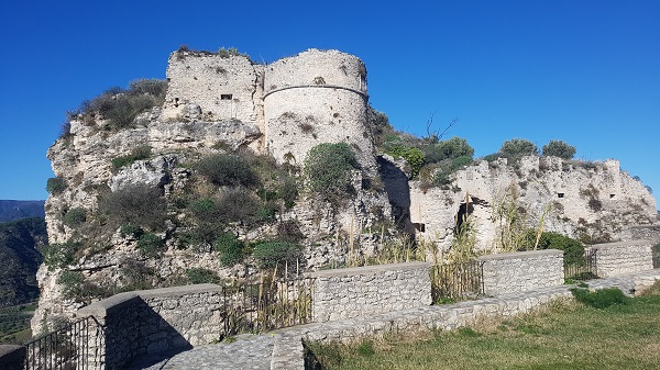 Siamo al termine della nostra passeggiata e ci aspetta l’ultimo breve tratto in salita, accompagnati, alla nostra destra, da una vista mozzafiato sulla vallata della fiumara Novito. Raggiungiamo così i ruderi del castello, in posizione dominante sulla rupe, di cui si conservano oggi un torrione cilindrico e tratti della cortina muraria. La rocca del castello è inaccessibile ed il collegamento, originariamente, avveniva mediante un ponte levatoio che si calava sul baglio, il rifugio della popolazione in caso di pericolo. L’edificio, ricordato più volte nelle fonti, esisteva già in epoca bizantina, ma fu ricostruito dai Normanni e subì nel tempo parecchi rimaneggiamenti, fino alla distruzione causata dal terribile terremoto del 1783.