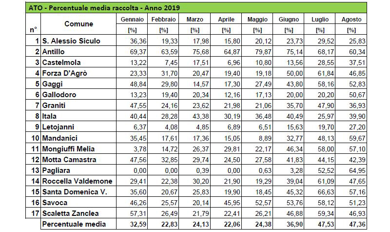 “La percentuale media raggiunta nel mese di agosto, del 47,36% – spiega il commissario Russo – dimostra, nell’ultimo trimestre, un trend di crescita rilevante in termini di qualità e quantità del rifiuto differenziato. Vanno infatti evidenziate le costanti performance positive dei Comuni di Antillo, Forza d’Agrò, Gaggi, Mandanici, Mongiuffi Melia, Pagliara, Roccella Valdemone, Santa Domenica Vittoria, Savoca e Scaletta Zanclea con punte anche al di sopra del 60%. Positivi i risultati raggiunti dal Comune di Letojanni con l’avvio dal mese di luglio 2019 della differenziata con il sistema porta a porta.