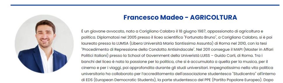 Sarà il 34enne Madeo, come si legge sullo stesso sito web ufficiale del partito, il responsabile nazionale Agricoltura prescelto da Carlo Calenda: nel suo passato prossimo, tra l’altro, un incarico da consigliere provinciale dell’Anga, l’Associazione nazionale giovani agricoltori.