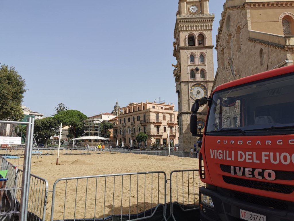 MESSINA – Al netto delle polemiche che continuano ad animare l’evento, in Piazza Duomo si continua a lavorare in vista del Volleyball World Beach Pro Tour – Europe Futures, manifestazione internazionale che si terrà a Messina dal 29 giugno al 2 luglio. Dopo aver sistemato le tre grandi aree riservate ai campi, con i camion che nei giorni scorsi hanno trasportato la sabbia adeguatamente setacciata dalle cave sulla Panoramica fino in centro città, ora i mezzi dei vigili del fuoco sono stati disposti in tutta la zona e l’area in cui sorgeranno bagni e docce per gli atleti è stata adeguatamente recintata.