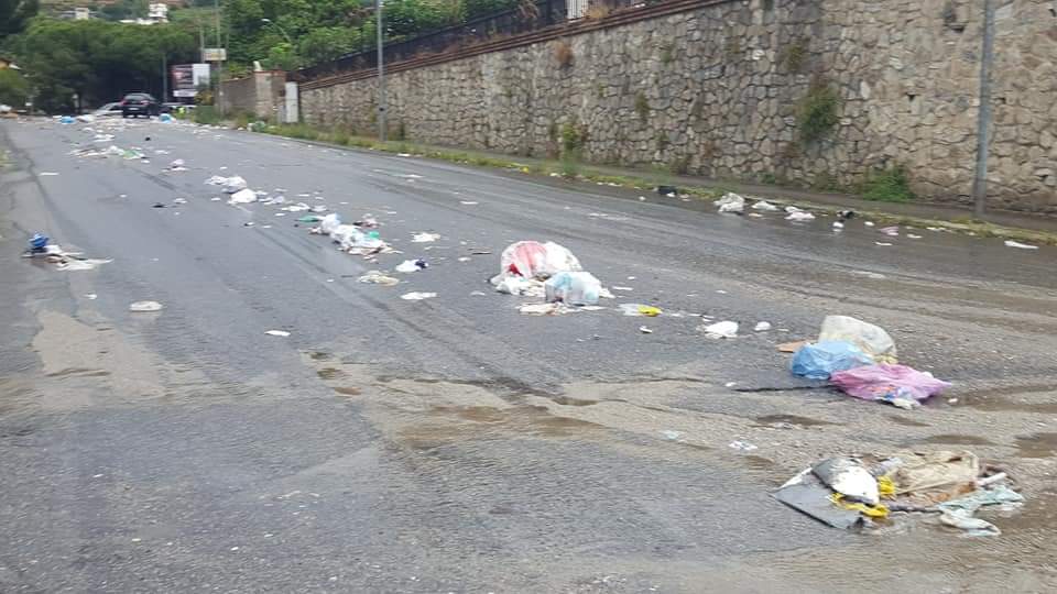 Nella foto grande, vediamo la situazione molto difficile creatasi nella parte finale di via Ecce Homo, all’incrocio con viale Messina. Siamo nella zona Sud di Reggio: qui la collinetta d’immondizia “selvaggia” s’è spalmata sulla strada, rendendo complicata la circolazione stradale.