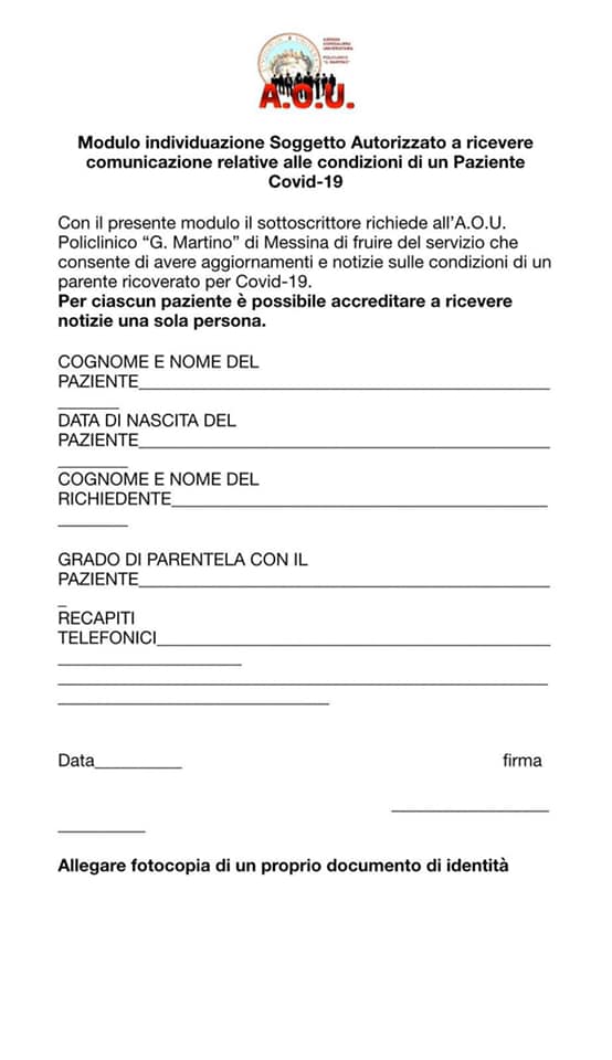 Il Policlinico “Gaetano Martino”, per adeguare il servizio al crescente numero di richieste, ha modificato l’indirizzo e-mail a cui inviare il modulo mediante cui accreditarsi per ricevere informazioni di familiari ricoverati per coronavirus.