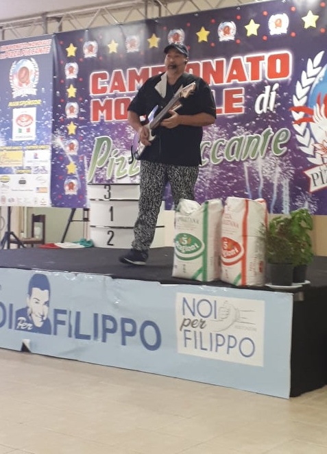 Prima della premiazioni ai pizzaioli, si è esibito con la sua chitarra elettrica nel ricordo di Filippo, figlio dell’organizzatore Francesco Matellicani