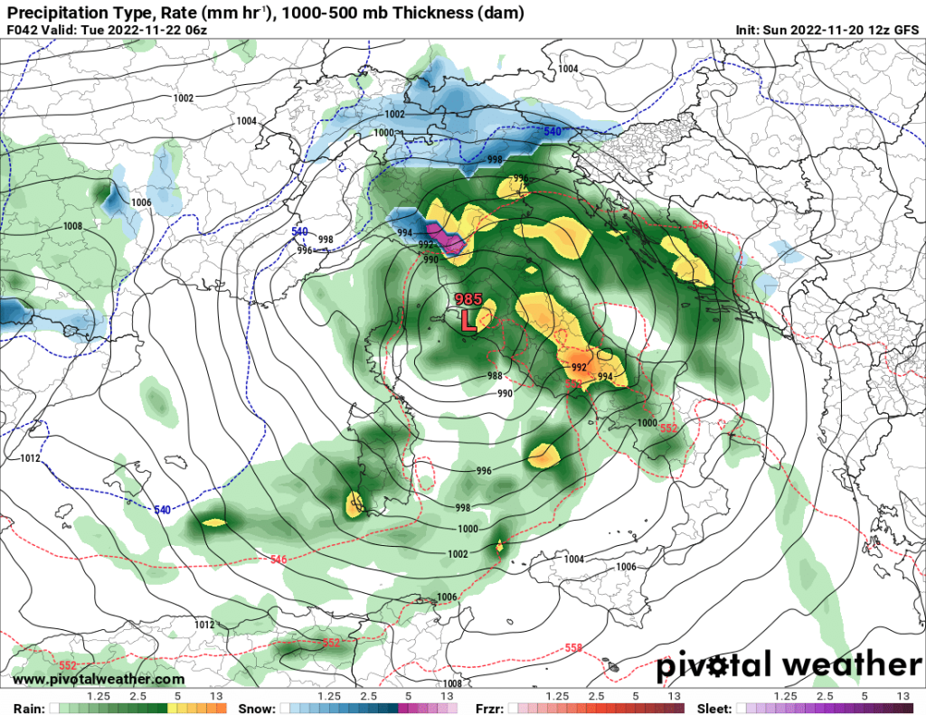 Secondo alcune simulazioni il minimo potrebbe raggiungere valori di 985 hPa o anche sotto tale soglia. Si tratterà di una ciclogenesi esplosiva.