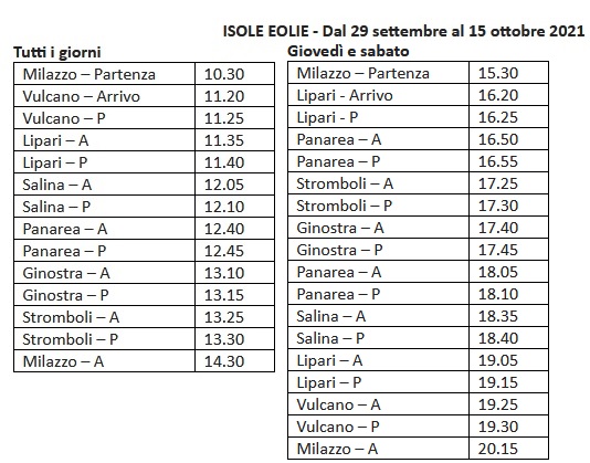 Dopo le perplessità espresse nei giorni scorsi da pendolari e operatori turistici delle isole Eolie, in merito ai collegamenti per le isole, Liberty Lines aumenta le corse da Milazzo per le Eolie e propone nuovi orari validi dal 29 settembre al 15 ottobre.