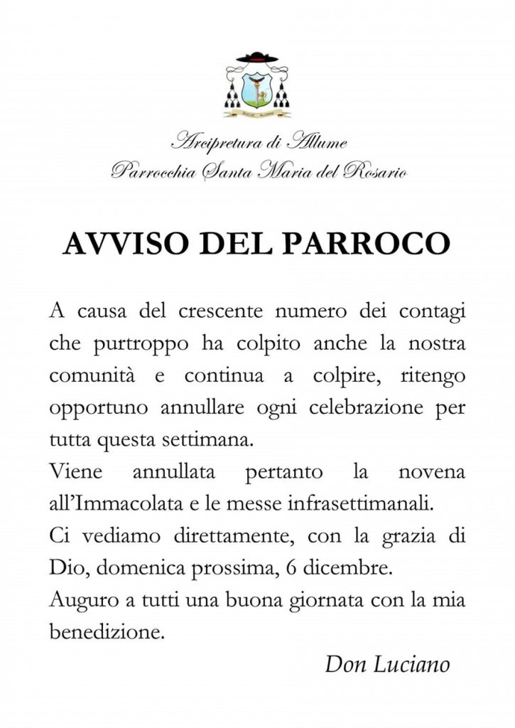 Covid. Padre Luciano D'Arrigo ha comunicato ai fedeli anche lo stop della novena all'Immacolata