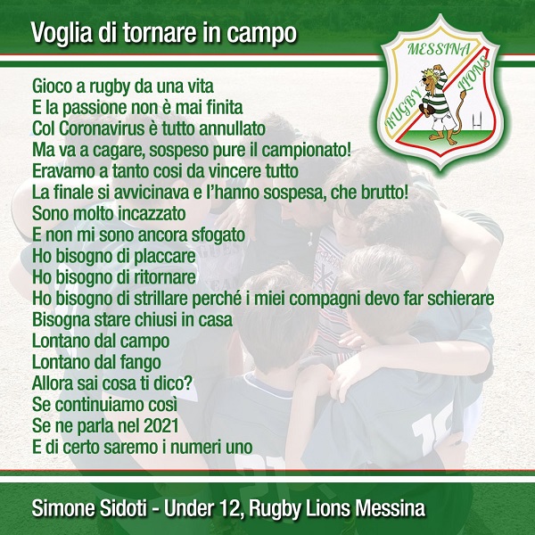 Già il primo messaggio è arrivato: è di Simone Sidoti, under 12 Rugby Lions Messina. S’intitola Voglia di tornare in campo e la pubblichiamo.
