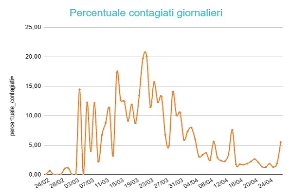 Solo 30 positivi ma su pochissimi tamponi, 546, con una percentuale del 5,5 %, il triplo dei giorni scorsi
