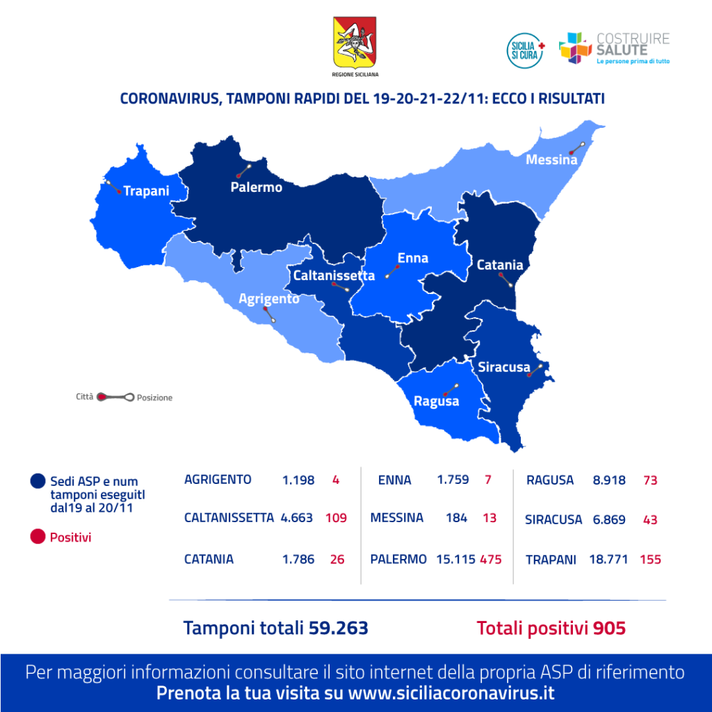 Oltre 59 mila i tamponi rapidi eseguiti negli ultimi quattro giorni (da giovedì a domenica) nell’ambito dell’attività per la ricerca del virus promossa dalla Regione Siciliana. Nei drive-in allestiti nelle principali città dell’Isola sono stati individuati 905 soggetti positivi (l’1,53 %), poi sottoposti al tampone molecolare, così come stabilito dai protocolli ministeriali. Per tutti sono quindi scattate le misure previste per il contenimento del contagio.