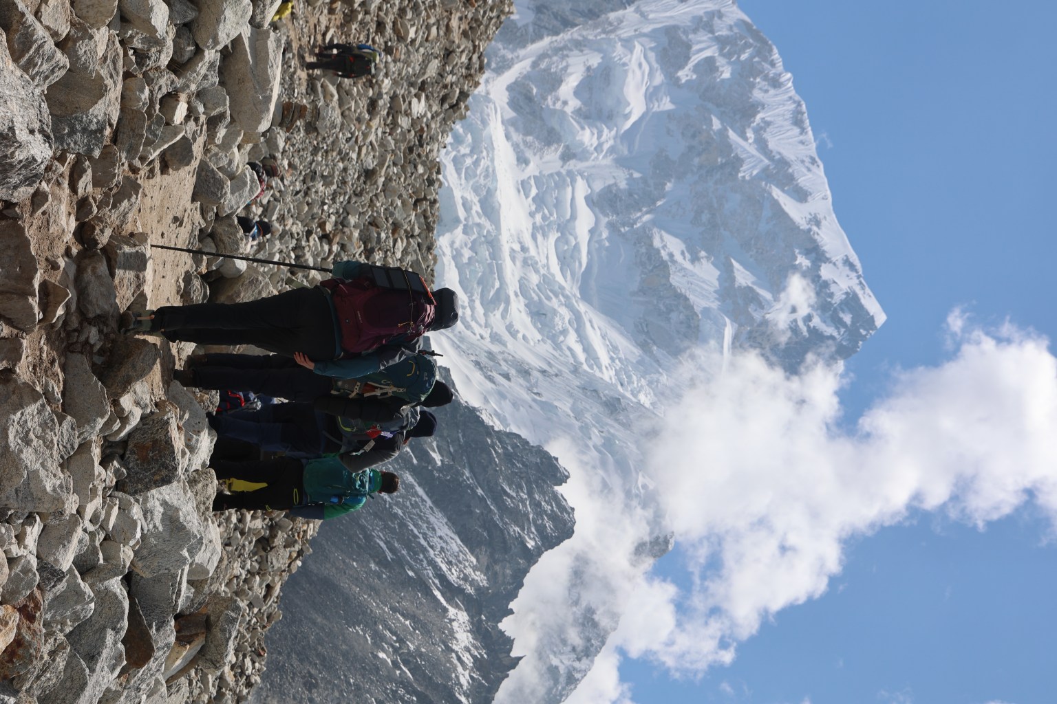 Su un altopiano incontriamo il memoriale dei caduti, i picchi innevati custodiscono i tanti chorten, pile di sassi commemorativi. Ci sono i nomi, le storie, i volti di chi su queste vette ha lasciato la vita per una sfida, un sogno. Un’atmosfera surreale, le bandierine garriscono al vento. Si tratta di lunghe strisce di preghiere buddhiste tibetane dipinte su pezzi di stoffa colorata, secondo le credenze popolari, le preghiere dovrebbero salire agli dei grazie ai venti.