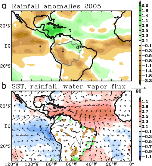 Nel 2010 però era presente la “Ninà”, mentre la terribile siccità del 2005 era stata associata ad un “El Ninò” sostanzialmente su posizione neutra. Successivi studi hanno evidenziato che la grave siccità del 2005, considerata come la peggiore del secolo, non era da attribuire alle anomalie pacifiche, ma bensì alle elevatissime temperature delle acque superficiali dell’Atlantico equatoriale che in quel periodo avevo toccato valori quasi da record. Le elevate temperature dell’Atlantico tropicale hanno contribuito a mantenere le temperature su valori largamente sopra le medie stagionali su 2/3 dell’Amazzonia, determinando al contempo un notevole rinsecchimento dell’atmosfera su tutta la vasta area del bacino, soprattutto sul versante più occidentale e sud-occidentale, tra la parte ovest dello stato dell’Amazonas e l’Acre. Ciò si traduce in temperature molto elevate, ma accompagnate da un clima alquanto secco, che inibisce l’attività convettiva in area equatoriale, con il conseguente indebolimento degli Alisei provenienti dall’Atlantico tropicale e il quasi dimezzamento delle precipitazioni convettive legate al passaggio del “fronte di convergenza intertropicale”.
