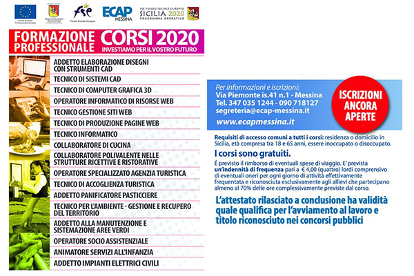 Sono ancora aperte presso ECAP MESSINA le iscrizioni ai Corsi Regionali di Formazione 2020/Avviso 8 . Percorsi Formativi di qualificazione mirati al rafforzamento dell’occupabilità in Sicilia. Nell’ambito dell’attuazione del Programma Operativo FSE 2014/2020, per Ecap Messina è stato approvato il Piano dell’Offerta formativa rivolta a disoccupati/inoccupati.