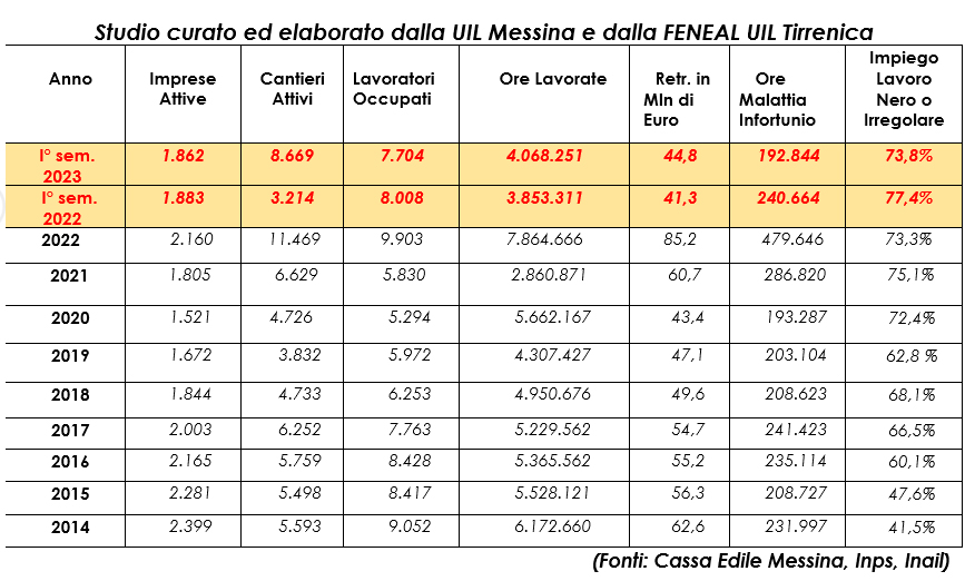 MESSINA – Come consuetudine, la Uil Messina e la Feneal Uil Tirrenica, in prossimità del Ferragosto, diffondono l’esito dello studio e dell’analisi dettagliata dei dati relativi allo stato dell’edilizia nella città metropolitana di Messina. “Un report che nel corso degli anni ha evidenziato la pesante e lunga crisi del settore che, fino al 2020, per oltre un decennio, ha drammaticamente investito l’edilizia: un comparto che da sempre è stato il volano per l’economia della provincia messinese. A partire dal 2021 è stata registrata una iniziale ripresa che ha ridato ossigeno al mondo del lavoro edile e all’imprese del comparto, mentre il 2022, sull’onda delle molteplici previsioni legislative approvate negli anni scorsi (il bonus 110, l’eco-bonus, il sisma bonus e il bonus ristrutturazioni), è stato caratterizzato da un vero e proprio boom con le positive conseguenze per tutti gli indicatori economici”. E’ l’analisi di Ivan Tripodi, segretario generale della Uil Messina e di Pasquale De Vardo, segretario generale della Feneal Uil Tirrenica.
