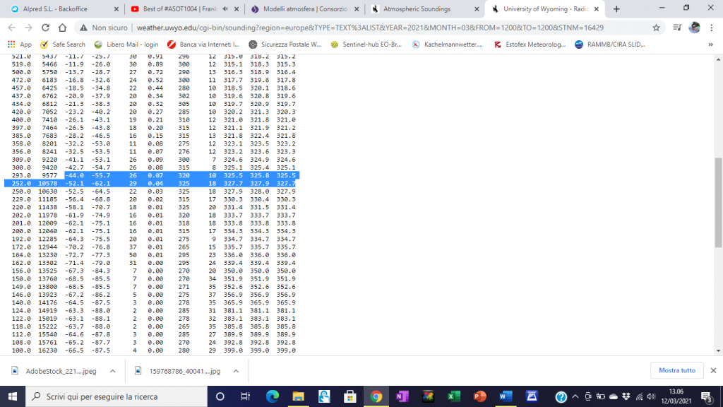La sonda meteorologica la scorsa notte ha registrato valori di circa -52,1°C a circa 10.578 metri di altezza, mentre a soli 9.577 metri erano presenti valori di -44,0°C. I dati del radiosondaggio di Trapani ci suggeriscono che il “pirocumulo” che dall’area sommitale dell’Etna si è spinto fino allo Ionio, anche stavolta ha raggiunto i 9/10 km di altezza, con dirette ripercussioni sul traffico aereo. Sempre al di sotto del livello della tropopausa, che sopra Trapani oggi era un po’ più alto del solito, sui 13.230 metri, con valori di temperatura di -72°C.
