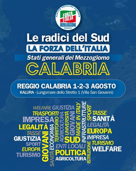 REGGIO CALABRIA – Si chiuderà a Reggio Calabria, dall’1 al 3 agosto, il percorso degli “Stati Generali del Mezzogiorno”, l’iniziativa nazionale di Forza Italia che, sotto il titolo “Le radici del Sud, la forza dell’Italia”, ha attraversato tutte le regioni meridionali con l’obiettivo di raccogliere istanze territoriali e trasformarle in proposte concrete da portare al Governo.
