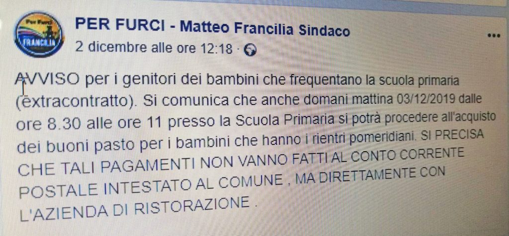 Il sindaco, Matteo Francilia, ha annunciato per venerdì mattina alle 10 un incontro nell’aula consiliare del Comune con i genitori dei bambini che frequentano la scuola dell’Infanzia e la Primaria “per essere informati sulle tabelle dietetiche approvate dall’Asp di Messina”. In un post su facebook, inoltre, il sindaco Francilia ha precisato che per quanto riguarda i bambini della Primaria (tranne la prima elementare a tempo pieno) “i pagamenti non vanno fatti sul conto corrente postale intestato al Comune, ma direttamente con l’azienda di ristorazione”. La distribuzione dei buoni è già iniziata nei giorni scorsi. Non sono mancati i disagi e le polemiche. Anche attraverso i social.