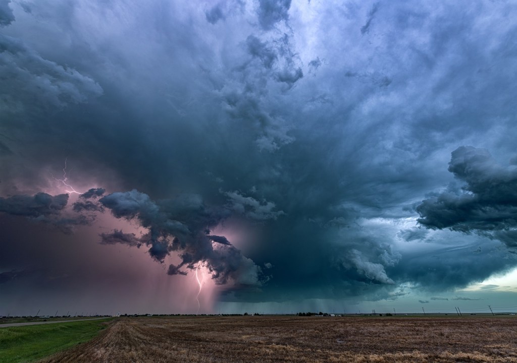 A mesocyclone weather supercell, which is a pre-tornado stage, passes over the Great Plains while pouring rain and cracking lightning highlight the horizon.