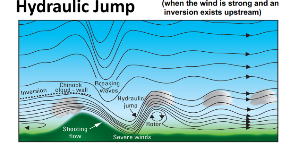Questa teoria ipotizza il flusso idrostatico di un fluido omogeneo delimitato da una superficie libera che passa sopra una barriera (in questo caso una barriera montuosa). In pratica il fenomeno mette in evidenza il delicato equilibrio che sussiste fra la velocità di una massa d’aria, la forza della differenza di pressione (gradiente barico orizzontale) che l’ha generata e la forza gravitazionale. Possiamo distinguere due casi didattici: 1) condizioni di flusso supercritico 2) condizioni di flusso subcritico.