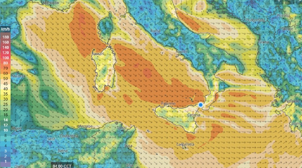 I forti venti di maestrale domani potrebbero produrre il fenomeno del “salto idraulico” lungo il versante sottovento dei Peloritani, con forti raffiche sulla città, nelle prime ore del mattino.