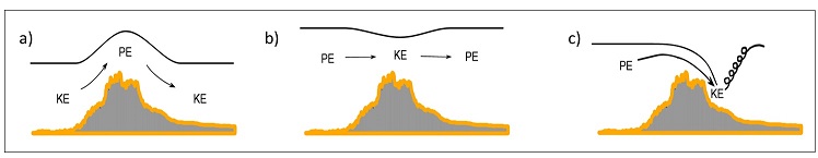 Durante le condizioni di flusso supercritico, la velocità della massa d’aria (il vento) è più forte della forza di gradiente di pressione. L’equilibrio è soddisfatto dal flusso che accelera nella stessa direzione della forza gravitazionale. Questo fa sì che le particelle di fluido, in questo caso l’aria, decelerino durante la salita, convertendo l‘energia cinetica (KE) in energia potenziale (PE), e accelerino durante la discesa, riconvertendo la PE in KE. Ciò fa in modo che il vento, durante la discesa acquisti ulteriore velocità, con raffiche di caduta dal rilievo (downslope wind) molto forti e turbolenti, rispetto al versante sopravvento.