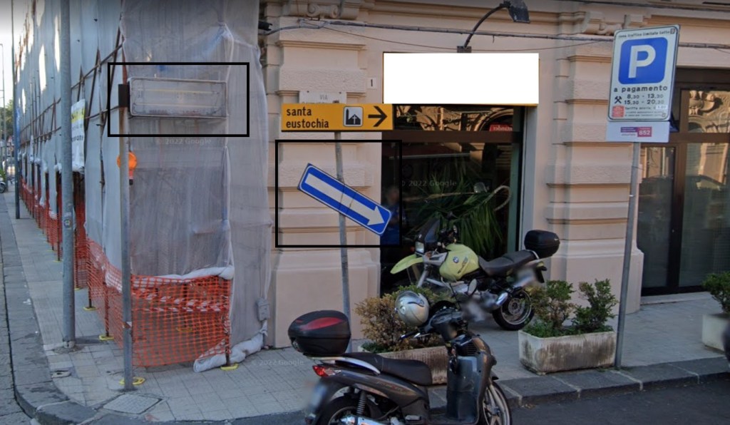Cartelli toponomastici che s’illuminano nelle ore serali. Il loro scopo doveva essere questo ma è fallito ben presto e, ormai da un paio di decenni o forse più, sono rimasti a fare solo degrado, in pieno centro città, anche perché alcuni sono pure storti.
