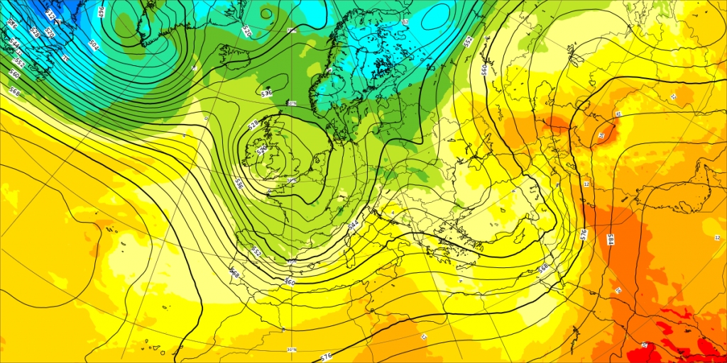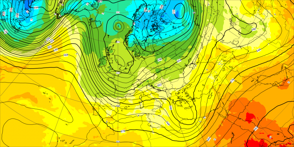 La mappa del centro europeo ci mostra il tipico pattern da NAO e AO positive, con geopotenziali bassi sul nord Europa