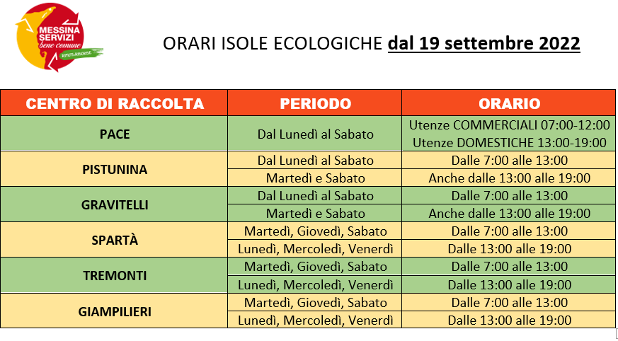 MESSINA – A partire da lunedì 19 settembre entreranno in vigore i nuovi orari al pubblico delle isole ecologiche cittadine. Lo comunicato Messinaservizi Bene Comune. Pistunina e Gravitelli saranno aperte dal lunedì al sabato dalle 7:00 alle 13:00, e il martedì e il sabato saranno aperte anche dalle 13:00 alle 19.00. Le isole ecologiche di Spartà, Tremonti e Giampilieri resteranno aperte martedì, giovedì e sabato dalle 7 alle 13 e lunedì, mercoledì e venerdì dalle 13:00 alle 19:00. L’isola ecologica di Pace invece resterà aperta dal lunedì al sabato, per le utenze commerciali dalle 7 alle 12, e per le utenze domestiche dalle 13 alle 19. In caso di guasti tecnici o per condizioni atmosferiche avverse, per i centri di raccolta potrebbe essere disposta la chiusura temporanea che verrà comunicata nella sezione news del sito di Messinaservizi e sulle pagine social della società.