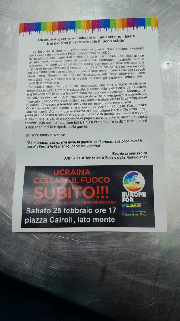 MESSINA – “Cessate il fuoco subito. Stop alla guerra tra Russia e Ucraina, senza invio di armi che alimentano il conflitto”. Anpi, Associazione nazionale partigiani d’Italia e Tenda della pace e della non violenza, con associazioni e cittadini pacifisti, si sono ritrovati a Piazza Cairoli sabato 25 febbraio, un anno dopo la guerra, in coincidenza con le iniziative mondiali e nazionali. Cartelli e volontini nei quali gli attivisti hanno espresso il loro punto di vista: “Solidarietà al popolo ucraino, vittima inerme, e ai disertori russi e ucraini. Tutte le forze pacifiste si mobilitino contro questa drammatica deriva bellicista”.
