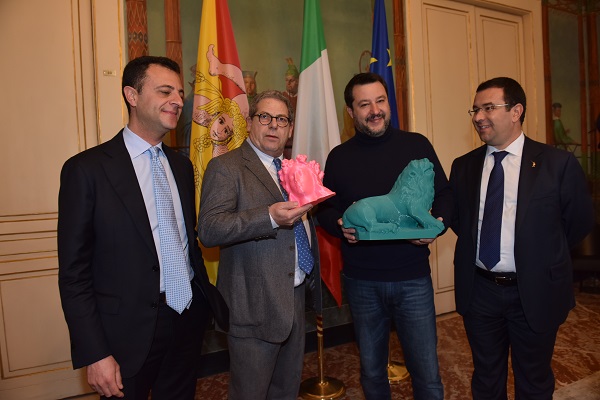 Il presidente dell’Ars ha donato a Salvini la riproduzione della testa di Santa Rosalia in fibra di mais di colore rosa, mentre il direttore della Federico II gli ha regalato la copia di uno dei due leoni marmorei del XII secolo, sempre in fibra di mais.Salvini ha ribadito ai cronisti che non c’è un rimpasto dietro l’angolo ma la comune volontà di affrontare tematiche urgenti che riguardano i territori. Ha definito positivi i due incontri di queste ore, con il governatore Musumeci e con Miccichè.