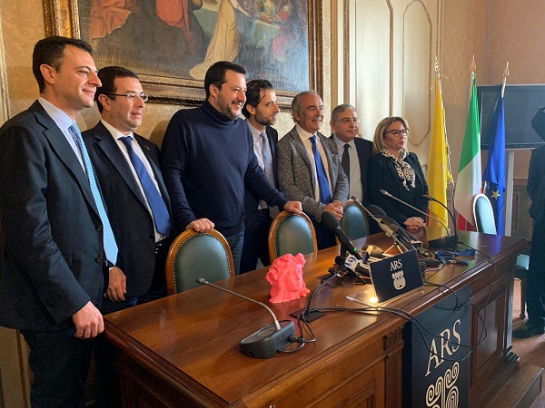 Il leader del Carroccio ha presentato il gruppo parlamentare “Lega Sicilia per Salvini Premier” formato da Antonio Catalfamo (capogruppo), Orazio Ragusa, Giovanni Pulla, Marianna Caronia. Insieme al leader leghista anche il senatore Stefano Candiani, commissario per la Lega in Sicilia e il parlamentare Nino Minardo.
