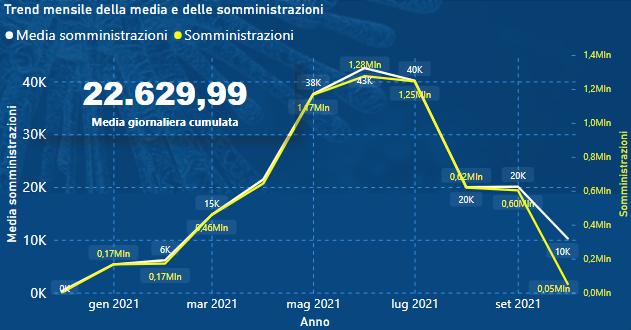 La media da inizio campagna vaccinale è di 22.630 dosi al giorno, in netta diminuzione rispetto ai mesi scorsi. Il picco massimo è stato raggiunto a giugno, con una media di 42.560 dosi al giorno e un totale di 1 milione 276mila 786 dosi. Nella prima settimana di ottobre sono state somministrate 79.921 dosi, con una media di 11.417 al giorno. Con riferimento solo alle prime dosi, nella settimana dal 22 al 28 settembre sono state 50.929, in quella dal 29 settembre al 5 ottobre 33.890, cioè 17.039 in meno (-33.46 %).