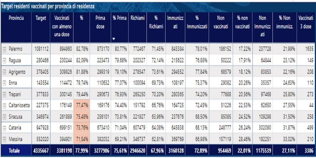 Palermo 82.78 % di prime dosi – 78.01 % di immunizzati; Ragusa 82.09 – 76.88; Agrigento 81.88 – 77.84; Enna 79.74 – 75.37; Trapani 79.44 – 74.20; Caltanissetta 77.47 – 72.45; Siracusa 75.48 – 68.50; Catania 73.76 – 68.13; Messina 71.54 – 66.98.