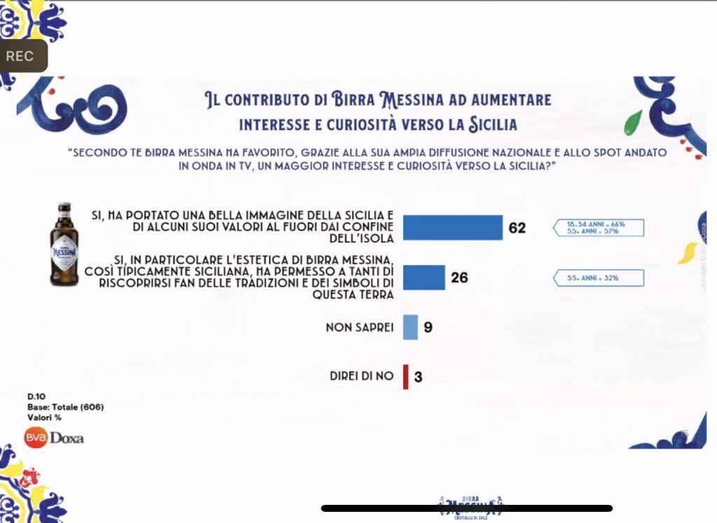 606 interviste condotte online dal 7 al 12 aprile 2021. Paolo Colombo, Research Manager di Doxa mosta, tra i vari e interessanti risultati della ricerca, che 9 siciliani su 10 consumano occasionalmente la Birra Cristalli di Sale, un terzo abitualmente e “per il 92% dei Siciliani Birra Messina Cristalli di Sale e la sua ricetta esclusiva rappresentano un simbolo positivo, per scoprire e valorizzare quanto sia bella la Sicilia”.