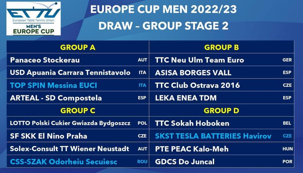 Per la Top Spin Messina EuCI, reduce dalla partecipazione al primo turno di Champions League e adesso di scena nell’altra competizione continentale, la seconda per importanza. Sarà un appuntamento storico, da vivere in casa, davanti al proprio pubblico. Il sorteggio effettuato sabato mattina dall’Ettu, a Cluj-Napoca in Romania ha determinato le avversarie della Top Spin Messina EuCI nella seconda fase di Europe Cup.