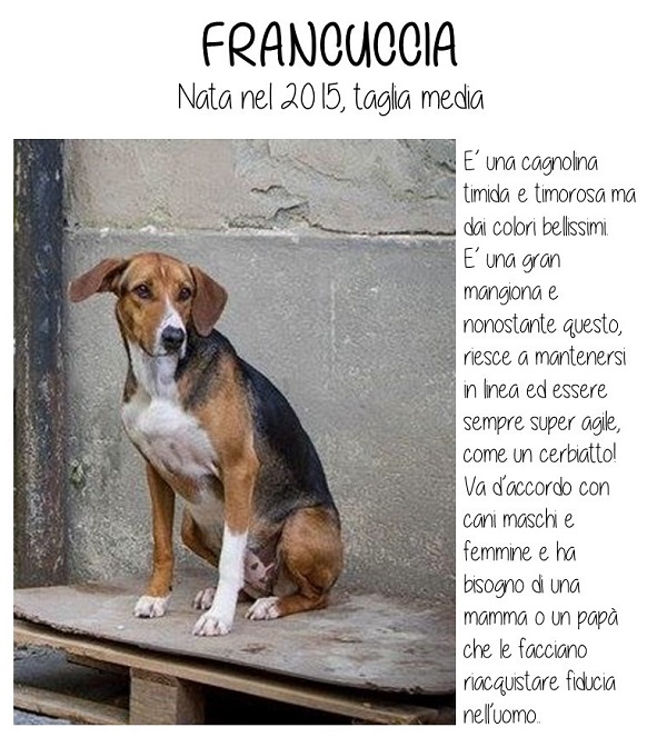 Solo chi ha avuto accanto un cane per un periodo della propria vita può capire che dono ineguagliabile sia avere il privilegio di poter regalare amore ed essere ricambiato per 100 volte da un amico a 4 zampe. Se potete donare affetto ricevendo in cambio un amore incondizionato che solo un cane sa donare, Nocciolina , Tim e Francuccia si trovano a Messina ma sono adottabili in tutta italia, per info rifugiodonblasco@gmail.com o lara 3463257134