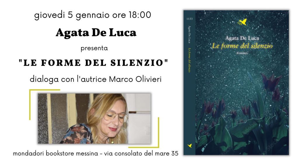 MESSINA – S’intitola “Le forme del silenzio” ed è un thriller psicologico. La scrittura di Agata De Luca, autrice messinese, scava negli abissi psicologici di personaggi dalla profonda umanità, alla ricerca non solo della verità di fatti delittuosi, ma anche della piena comprensione e dell’accettazione di sé. Il romanzo, pubblicato per Giovane Holden Edizioni, viene presentato giovedì 5 gennaio, alle 18, alla libreria Mondadori di Messina, in via Consolato del Mare n. 35. Dialogherà con l’autrice, alla sua opera prima, il giornalista Marco Olivieri, direttore di Tempostretto.