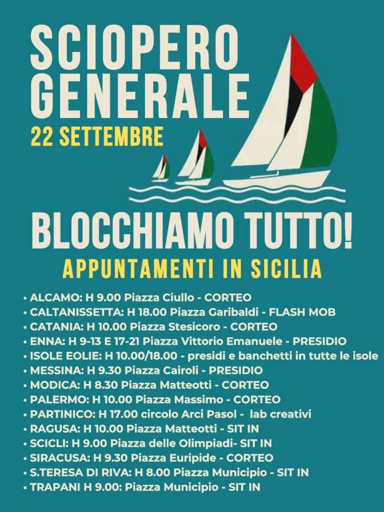 Sciopero generale per la popolazione palestinese lunedì 22 settembre. Una decisione che riguarda treni, bus, navi e scuole. L’obiettivo è manifestare la propria solidarietà contro il genocidio e a sostegno della missione della Global Sumud Flotilla, partita con un carico di aiuti umanitari in direzione Gaza. Usb e i sindacati di base (Cub, Adl, Sgb) lo hanno promosso. L’appuntamento a Messina è alle 9.30 con un presidio a piazza Cairoli.