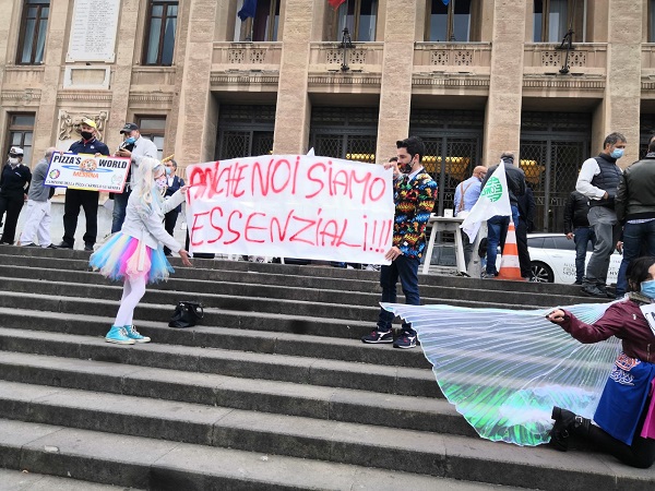 “Per noi è un lento suicidio economico. Non ci chiudete ufficialmente ma ci state facendo morire”. L’urlo della piazza è unitario, composto, ma disperato. Ci sono i “piccoli”, quelli che a livello nazionale non hanno trovato nessuno che li difende, quelli definiti di volta inessenziali ma che costituiscono l’ossatura dell’economia del quotidiano. Ristoranti, bar, locali, aziende del settore catering ed eventi, animatori. Per la prima volta sono unite tutte le sigle, perché a unirli sono i Dpcm e le notizie sul coprifuoco.