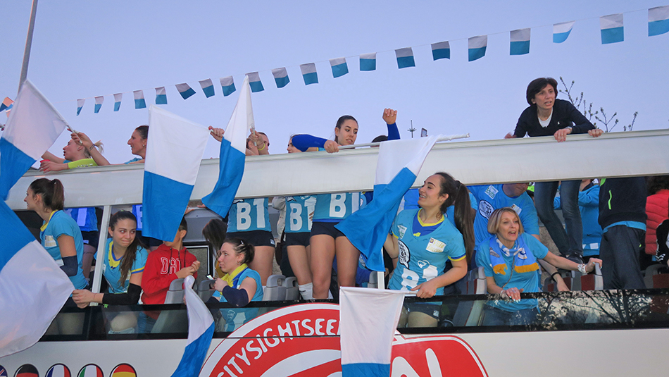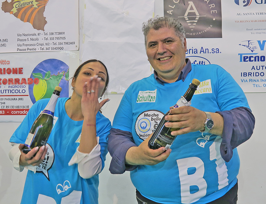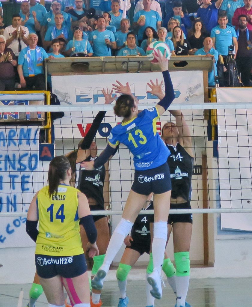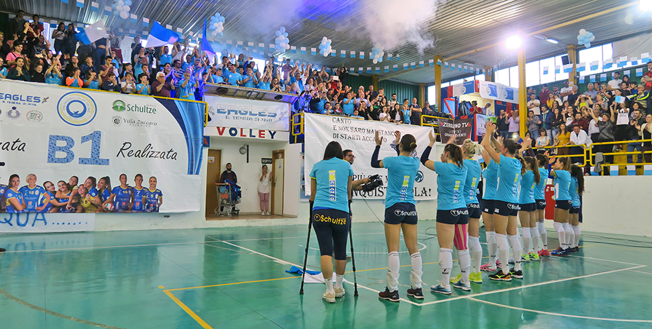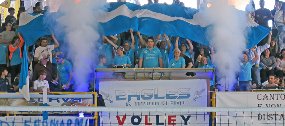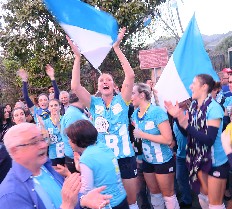 Una festa. E che festa! Con due tifoserie calorose e corrette che fanno onore al volley. Intonano inni per le proprie beniamine e per le avversarie. A far rullare per primi i tamburi sono i sostenitori calabresi. Le squadre entrano in campo e si accende la coreografia biancazzurra dei tifosi locali. In curva campeggiano le gigantografie delle giocatrici santateresine, protagoniste, tutte, di una straordinaria impresa. In testa capitan Valentina Rania, la banda di Riva del Garda da tre anni trapiantata a S. Teresa di Riva. Il metronomo della squadra.
