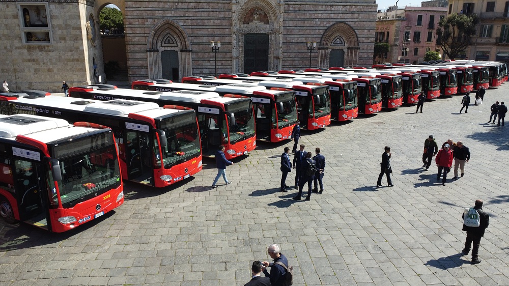 MESSINA – 25 bus a Piazza Duomo. Nelle intenzioni dei rappresentanti delle istituzioni, con tanto di presentazione in grande stile, nel segno della mobilità, con nuovi mezzi più “ecologici” e confortevoli. Sono stati presentati oggi i 25 nuovi autobus che sono entrati a far parte della flotta di Atm. Alla presenza del sindaco Federico Basile, del vicesindaco Salvatore Mondello, delle autorità istituzionali e dei vertici aziendali, i mezzi sono stati schierati per mostrarli alla cittadinanza e alla stampa. Si tratta di diciassette veicoli ibridi da 12 metri, quattro bus snodati da 18 metri, tre bus da 10 metri e un bus da 8 metri, di ultima generazione. Tutti i modelli si distinguono per il basso impatto ambientale, con motorizzazioni ibride e Euro 6 che garantiscono emissioni ridotte.