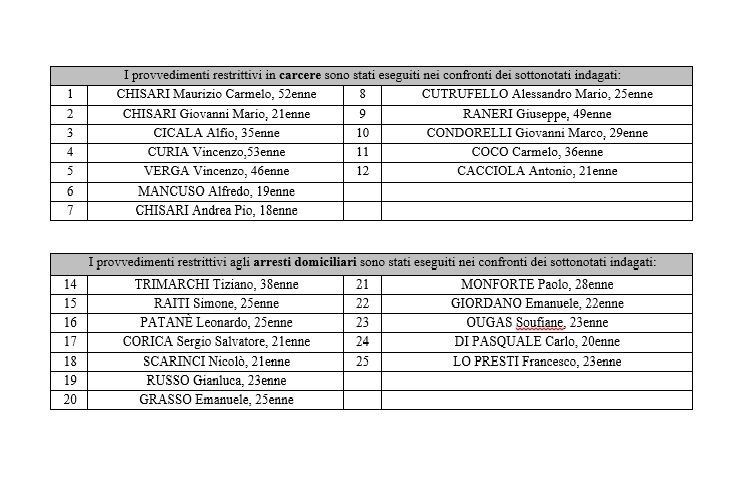13 persone in carcere e 13 ai domiciliari. 16 su 26 hanno tra i 18 e i 24 anni. L’operazione “Alcantara” ha colpito una rete di distribuzione di droga a Taormina, Giardini Naxos e nella valle dell’Alcantara, nei Comuni di Gaggi, Francavilla di Sicilia, Motta Camastra, Graniti, Malvagna, Mojo Alcantara e Roccella Valdemone.