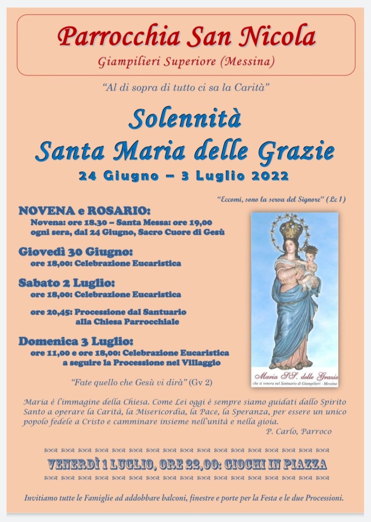 L’iniziativa di sabato scorso avvia una serie di momenti a cura della parrocchia San Nicola a Giampilieri Superiore, in vista della festa della Madonna delle Grazie a Giampilieri il 2 e 3 luglio. A San Biagio Altolia la festa è in programma l’ultima domenica di luglio, mentre quella della Madonna della Scala a Molino sarà il 2 agosto.