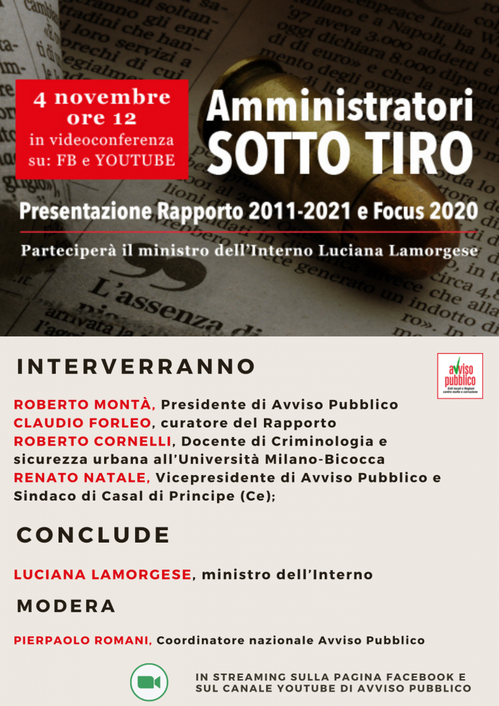 Questi i dati salienti emersi, questa mattina, nel corso della presentazione del rapporto di Avviso pubblico Amministratori sotto tiro, giunto alla sua decima edizione, relativa alle intimidazioni subite nel 2020.