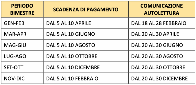 La presidente, nel dare la comunicazione del cambio di cadenza, invita anche tutta l’utenza ad utilizzare il sistema di autolettura, “affinché le bollettazioni siano sempre riferite ai consumi reali” dice. Nella tabella riportata qui sotto evidenziate le scadenze sia dei pagamenti che dell’invio dell’autolettura.