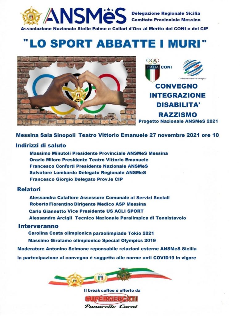 MESSINA – Integrazione disabilità e razzismo sono certamente “muri” da abbattere, lo sport può contribuire a farlo. Questo è il tema del convegno organizzato dall’AnsMes di Messina presieduta da Massimo Minutoli.
