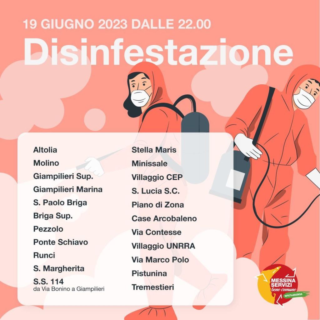 MESSINA – Messina Servizi comunica che a partire da oggi, 19 giugno, verranno espletati nella zona Sud i servizi di disinfestazione utilizzando anche mezzi transpallet. Ai cittadini, viene raccomandato di evitare l’esposizione all’aperto di alimenti e indumenti, di mettere al riparo animali domestici e da compagnia, di chiudere finestre e balconi e di lavare accuratamente frutta e verdura coltivata in orti e giardini del centro urbano.